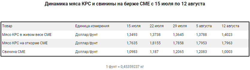Всего с 5 по 12 августа котировки мяса КРС в живом весе поднялись с 1,3788 до 1,4023 доллара за фунт или на 1,70%. Котировки мяса КРС на откорме повысились с 1,7953 до 1,7963 доллара за фунт или на 0,06%. Котировки свинины упали с 1,2083 до 1,0003 доллара за фунт или на 17,21%.