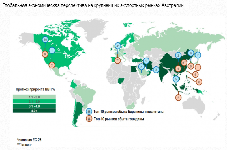 Тем не менее, если мировая экономика будет придерживаться своего курса, она будет поддерживать спрос на красное мясо на многих ключевых экспортных рынках Австралии, представленных на графике ниже. Из 10 крупнейших рынков сбыта австралийской говядины, по прогнозам, в 2018 году ожидается рост реального валового внутреннего продукта в 2018 году, превышающий 2%, и ожидается, что Китай, Индонезия и Филиппины увеличат ВВП на 6,5%, 5,3% и 6,3%. Аналогичная ситуация сложится и на 10 крупнейших экспортных рынках Австралии по баранине.