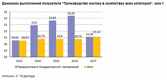 Из него видно, что задание выполнено только за 2017 г., а в предыдущие годы не выполнялось. На самом деле ситуация была примерно одинаковой, а различия объясняются лишь выбором планового показателя: за 2013–2016 гг. плановые индикаторы приведены по первоначальной Госпрограмме, утвержденной в 2012 г., а за 2017 г. – скорректированный показатель. Если использовать первоначальное задание по объемам производства молока – 35,15 млн т, то в 2017 г. индикатор окажется достигнутым не на 100,1%, а всего лишь на 88%.