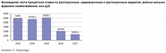 На поддержку малых форм хозяйствования в 2017 г. было направлено 10,3 млрд руб. Средства были использованы на поддержку начинающих фермеров (3,8 млрд руб.), развитие семейных животноводческих ферм (3,7 млрд), потребительских кооперативов (1,5 млрд) и возмещение процентной ставки по кредитам (1,3 млрд). По первым трем направлениям в 2017 г. наблюдался рост по сравнению с предыдущими годами, а по субсидированию кредитов, несмотря на директивно определенную долю малых форм хозяйствования не менее 20% (Постановление Правительства РФ № 358 от 27 декабря 2016 г.), суммы субсидий в последние годы катастрофически упали (рис. 2). Малый бизнес в 2017 г. получил почти в 5 раз меньше субсидий, чем в 2015 г. Его доля в этих субсидиях составляла около 2% и была в 10 раз меньше установленной правительством. Малый бизнес фактически отлучили от субсидируемых кредитов, хотя доля крестьянских (фермерских) хозяйств (КФХ) в валовой продукции сельского хозяйства в 2017 г. достигла почти 13%.