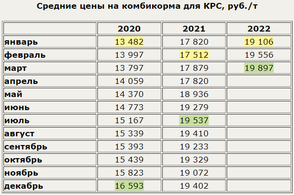За период с января 2020 г. минимальная цена на комбикорма для КРС в России зафиксирована в январе 2020 г. - 13,5 тыс. руб./т, обращает внимание SoyaNews; максимумом для данного продукта стала цена, зафиксированная в марте 2022 г. - 19,9 тыс. руб./т.