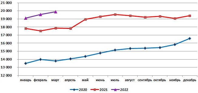 Средняя цена комбикормов для КРС в марте 2022 г. составила 19,9 тыс. руб./т. - это на 1,7% больше, чем месяцем ранее, и на 11,3% больше, чем в марте 2021 года.