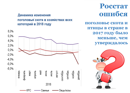 В декабре стало известно о том, что Росстат пересмотрел данные о поголовье скота и птицы в стране. Выяснилось, что скота и птицы в России меньше, чем ранее оценивало ведомство. В основном Росстат пересчитал данные по хозяйствам населения, а также КФХ и индивидуальным предпринимателям. Значительнее всего в сторону снижения пересмотрены показатели по КРС, также скорректированы показатели по численности свиней и птицы. По овцам и козам ошиблись меньше всего. Ошибки статистики можно объяснить лишь желанием регионов успешно отчитаться по линии господдержки АПК, которая, к слову, снова увеличена до 294 млрд. рублей, что опять же не исключает повторения прежних огрехов со статистикой и в будущем, если не будут усилены меры контроля над освоением бюджета. Тем не менее, не все так плохо «в датском королевстве»: мясной сектор РФ удерживается в плюсе и демонстрирует однозначный позитивный тренд.