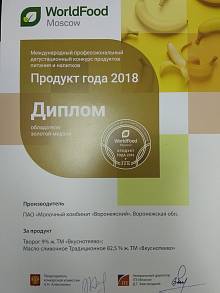 В столице состоялась церемония награждения победителей профессионального дегустационного конкурса «Продукт года», который ежегодно проходит в рамках международной выставки продуктов питания World Food Moscow. Сразу два продукта компании «Молвест» - творог жирностью 9% и масло традиционное «Вкуснотеево» с массовой долей жира 82,5% удостоены золотых медалей и звания «Продукт года 2018».