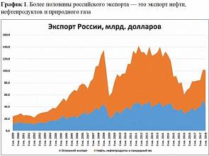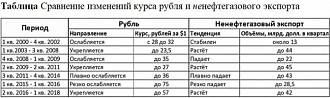 Так называемый "нефтегазовый" экспорт (экспорт нефти, нефтепродуктов и природного газа) составляет более половины всего экспорта (от 55% до 60% в разное время). Бросается в глаза бурный рост экспорта в 2003-2008 гг., когда курс рубля сильно (с 32 руб. до 23 руб. за доллар) укрепился. С другой стороны, при ослаблении рубля в начале 2009 г. объемы экспорта, вместо того чтобы вырасти, резко снизились. Такая динамика экспорта, противоречит известному правилу "чем слабее домашняя валюта, тем лучше условия для экспорта". Но это легко объяснить динамикой цен на углеводороды, которые в российском экспорте преобладают.