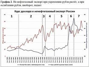 Но, увы, этого объяснения недостаточно. Рассмотрим отдельно так называемый не-нефтегазовый экспорт, то есть экспорт за вычетом нефти, нефтепродуктов и газа (на графике 1 выше - это синяя область). Если сравнить его с курсом рубля, то увидим, что парадоксальная картина сохраняется. Вопреки всеобщему заблуждению при ослаблении рубля даже экспорт за исключением углеводородов не растет, а падает. И, наоборот, при укреплении рубля наблюдается рост экспорта (график 2).
