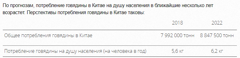 Из-за растущего разрыва между внутренним производством и спросом Китаю все больше придется полагаться на импорт для восполнения этого разрыва - дефицит между внутренним производством и потреблением говядины увеличится на 24% с 865 500 тонн (в убойном весе) в 2018 году до 1 072 900 тонн к 2022 году (Источник: BMI Research).