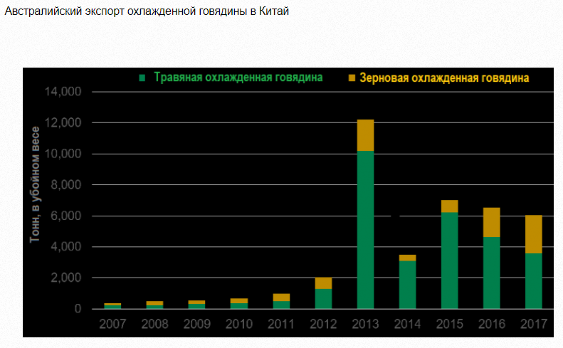 Только за последние 10 лет прямой импорт охлажденной говядины в Китай увеличился почти с нуля в 2007 году до 6558 тонн (в убойном весе) в 2017 году, причем Австралия экспортировала подавляющее большинство этого объема.