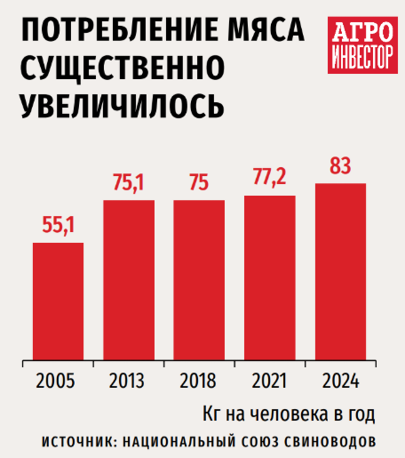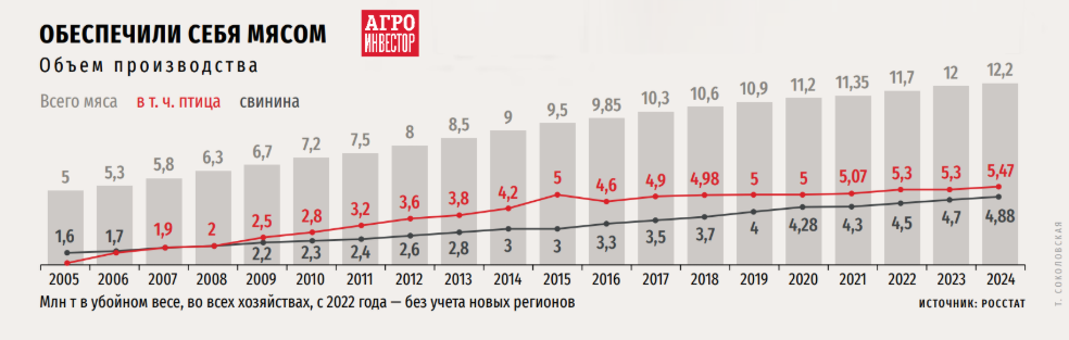Отрасли больше не нужны ежегодные темпы прироста на 5-10%, которые были до 2024 года, подчеркивает Ковалев. «Мы выполнили основные задачи, связанные со снижением импорта, ростом потребления и экспорта, — отметил он. — Начиная с 2025 года ежегодный рост производства будет составлять порядка 1-3%. Такие показатели позволят бизнесу развиваться и сбалансируют риски, связанные с резким всплеском спроса или снижением производства, например по эпизоотическим причинам».