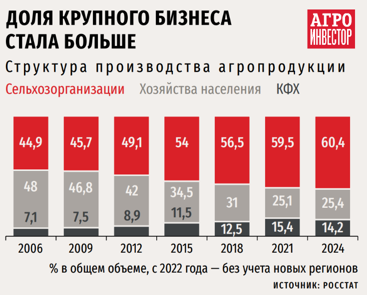 Ведущий научный сотрудник Центра агропродовольственной политики Института прикладных экономических исследований РАНХиГС Денис Терновский отмечает, что фокус на развитие малых форм хозяйствования в первом нацпроекте оказался противоречивым. «С одной стороны, динамика роста объемов производства фермерских хозяйств вполне впечатляет, но с другой — именно в период старта нацпроекта стали широко известны агрохолдинги, и рост сельского хозяйства за 20 лет — это главным образом увеличение выпуска в сельхозорганизациях, — комментирует он. — Ориентируемся на поддержку животноводства, а в фермерских хозяйствах опережающими темпами растет растениеводство, которое получает меньше ресурсов».