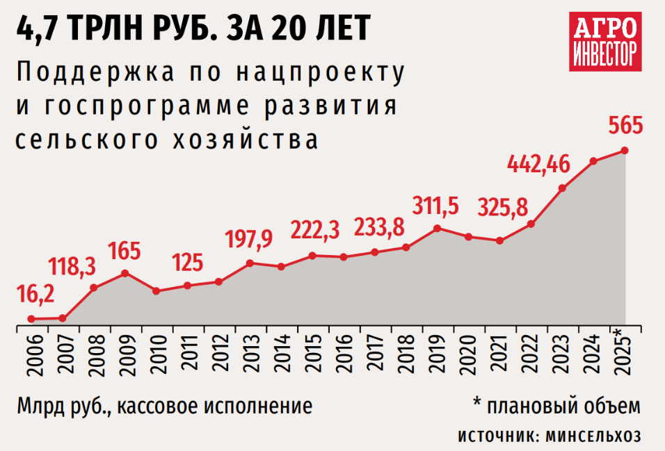 За прошедшие 20 лет с момента запуска первого нацпроекта государство направило в отрасль около 4,7 трлн руб. из федерального бюджета. За это время менялись объемы и форматы господдержки АПК, корректировались правила субсидирования и приоритетные направления, и не всегда бизнес положительно оценивал нововведения. Тем не менее начало системной поддержки отрасли со стороны государства было важным и своевременным, считает исполнительный директор практики бизнес-консультирования компании «Технологии Доверия» («ТеДо») Антон Виноградов. Нацпроект пришелся на момент, когда отрасли требовались «длинные» деньги и понятные правила, а ключевые сегменты с высокой добавленной стоимостью (мясо и молоко) оставались инвестиционно недофинансированными, напоминает он. В 2006-м государство стало субсидировать две трети ставки по кредитам, полученным на строительство и модернизацию животноводческих комплексов на срок до восьми лет. «Выбор направлений для поддержки в целом был рациональным. Ставка на животноводство дала максимальный эффект, потому что субсидирование ставок и запуск кредитной инфраструктуры резко снижали стоимость капитала и делали проекты масштабируемыми», — говорит он.