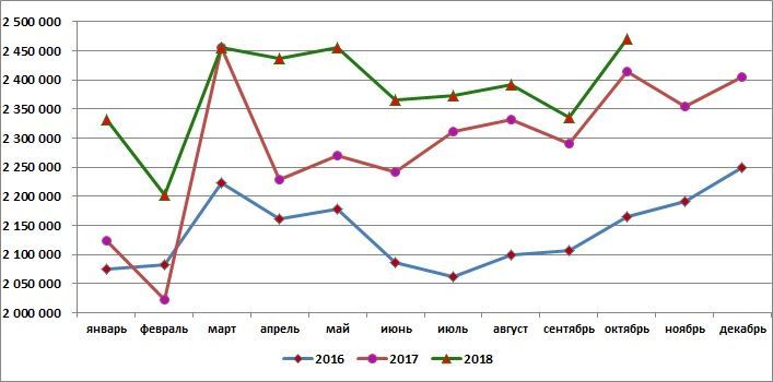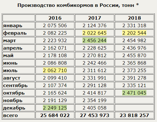 В октябре 2018 г. в России произведено 2471,0 тыс.тонн комбикормов - на 5,8% больше, чем в предыдущем месяце, и на 2,3% больше, чем в октябре 2017 г.