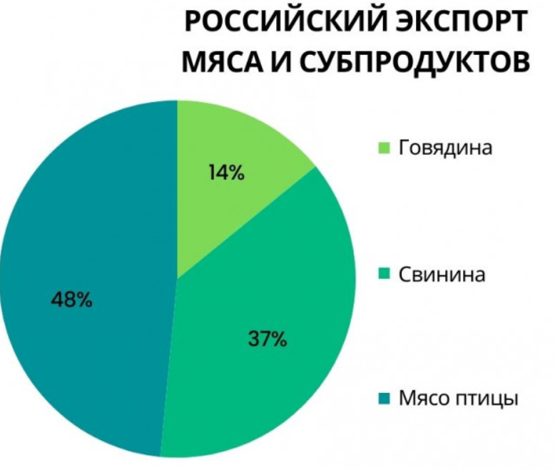 Мясо и субпродукты птицы заняли 48% в структуре российского экспорта, а прирост год к году составил 17% — до $800 млн. Еще 37% поставок пришлись на свинину, они увеличились на 42% — свыше $610 млн. Поставки говядины составили в общем объеме 14% и выросли на 16% — болеем чем $230 млн.