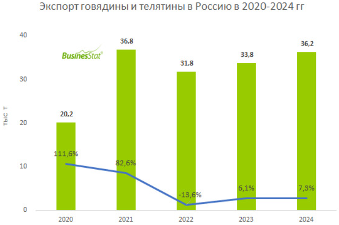 Поставки говядины и телятины из России в 2020-2024 годах выросли с 20,2 до 36,2 тыс. т. В 2024 году экспорт говядины и телятины увеличился на 7,3%, на это повлиял рост поставок в Саудовскую Аравию и Узбекистан (данные «Анализа рынка говядины и телятины в России» — BusinesStat).