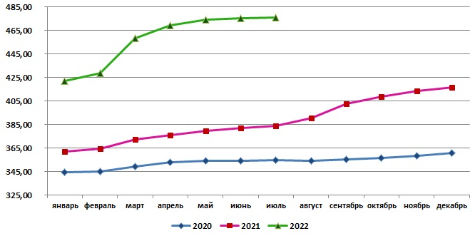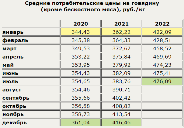 В июле 2022г. говядина (кроме бескостного мяса) в России стоила в среднем 476,09 руб./кг - на 0,1% больше, чем в предыдущем месяце, и на 24,1% больше, чем в июле 2021г. С начала года цена выросла на 12,8%. Это новый ценовой рекорд для данного товара.