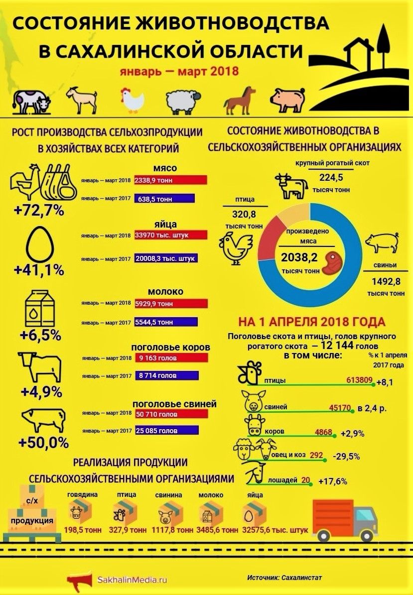 Согласно данным Сахалинстата, за январь — март 2018 года все сельхозпроизводители Сахалинской области произвели 2,3 тысячи тонн скота и птицы на убой в живом весе. Это превышает аналогичный показатель 2017 года на 72,7%.