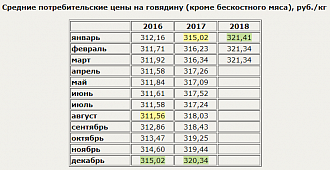 За период с января 2016 г. минимальная цена на говядину зафиксирована в августе 2016 г. - 311,56 руб./кг, отмечает SoyaNews; максимальная - в январе 2018 г.: 321,41 руб./кг.