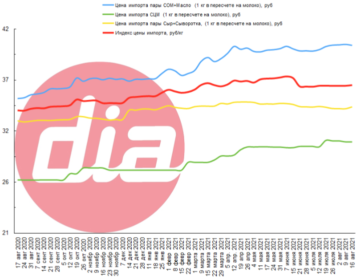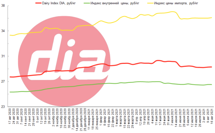 Dairy Index DIA на 16 августа 2021 составил 28,91 руб/кг (без НДС, жир-3,6%, белок-3,0%), на 0,07% выше прошлой недели и 5,4% выше августа 2020 года. Ключевым фактором роста индекса стало повышение цены импорта, обусловленное ростом цен на биржевые молочные продукты, средневзвешенная цена на молоко в России по данным приложения Index DIA снизилась.