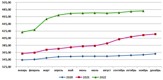 В ноябре 2022 г. говядина (кроме бескостного мяса) в России стоила в среднем 481,46 руб./кг - на 0,3% больше, чем в предыдущем месяце, и на 16,4% больше, чем в ноябре 2021 г. С начала года цена выросла на 14,1%.