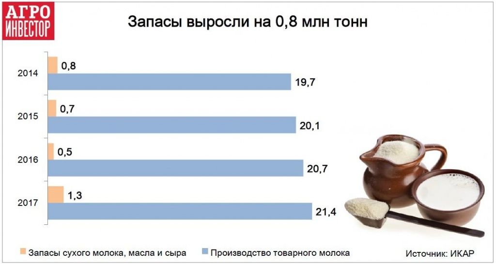 По данным Национального союза производителей молока («Союзмолоко»), запасы молочной продукции в январе были в два раза больше, чем в начале 2016 года. «Ситуация нетипичная, никто не ожидал, что можно столкнуться с тем, что молока будет много, как это не парадоксально звучит», — сказал на конференции исполнительный директор организации Артем Белов. По его словам, 2017 год был переломным для молочной отрасли: влияние антисанкций и фактора слабого рубля сошли на нет, отечественные производители заполнили нишу выбывших зарубежных производителей, сейчас им приходится «активно толкаться локтями», конкуренция усиливается. Серьезное влияние на рынок в 2018 году продолжит оказывать падение спроса, который напрямую зависит от размера реально располагаемых доходов населения, которые тоже в последнее время не увеличиваются.