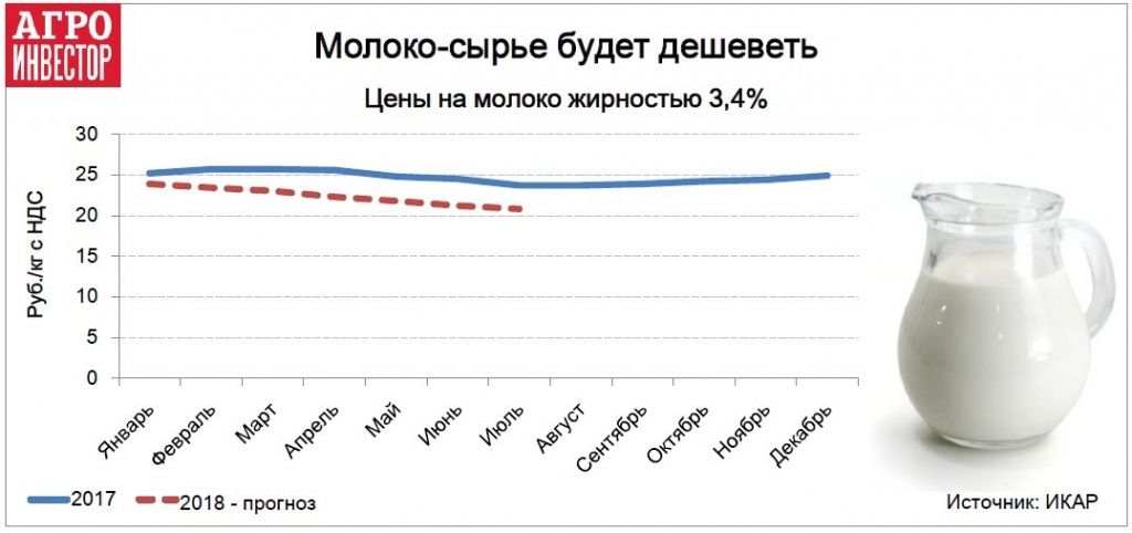 По данным ИКАР, в январе сырое молоко (жирностью 3,4% и содержанием белка 3%) в среднем стоило около 23,9 руб./кг с НДС. По мнению Дмитрия Рылько, если не решить вопрос роста запасов вследствие падения спроса на готовую молочную продукцию, то не исключена отрицательная динамика цен на сырое молоко в ближайшие месяцы. «Соответствующим будет и воздействие на прибыльность хозяйств, на численность поголовья, а также на инвестиционное настроение наших аграриев», — полагает он. В случае реализации неблагоприятного сценария молоко-сырье к середине лета может подешеветь до 20,8 руб./кг, что будет ниже уровней за аналогичный период в 2016 году, прогнозирует ИКАР.