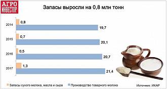 По оценке Института конъюнктуры аграрного рынка (ИКАР), в 2017 году производство товарного молока в России увеличилось на 700 тыс. т до 21,4 млн т. Однако весь рост объемов ушел в запасы продукции, которые за год увеличились на 800 тыс. т до 1,3 млн т в пересчете на сырое молоко. В том числе, на хранение отправлена половина от прироста производства сливочного масла. А в сегменте сухого молока, ситуация и вовсе близка к катастрофической: увеличение запасов в 2,5 раза превысило показатель расширения объемов выпуска продукта. Об этом рассказал гендиректор ИКАР Дмитрий Рылько на IX международной конференции «Где маржа».