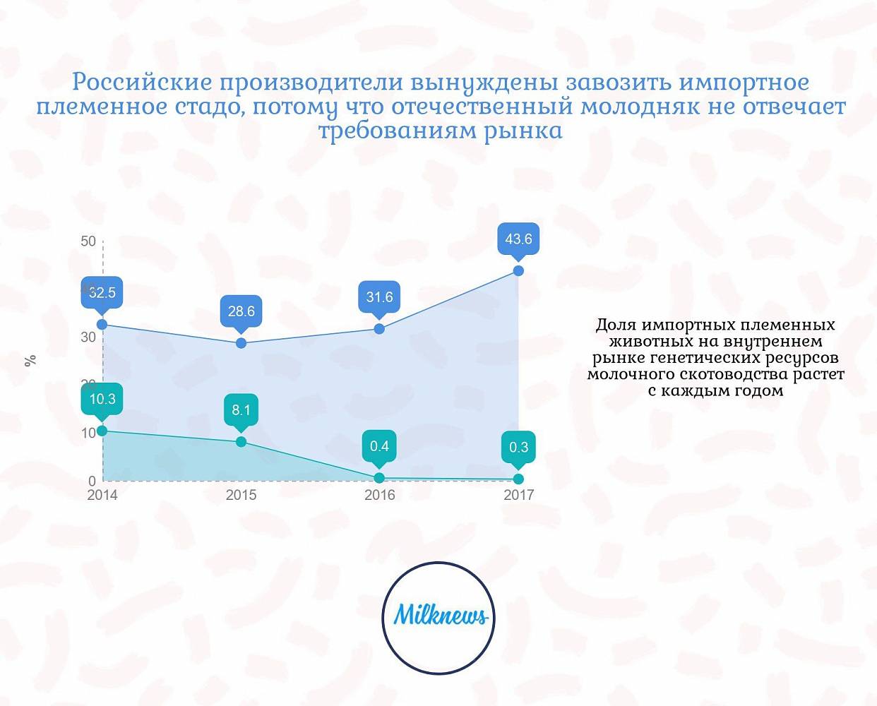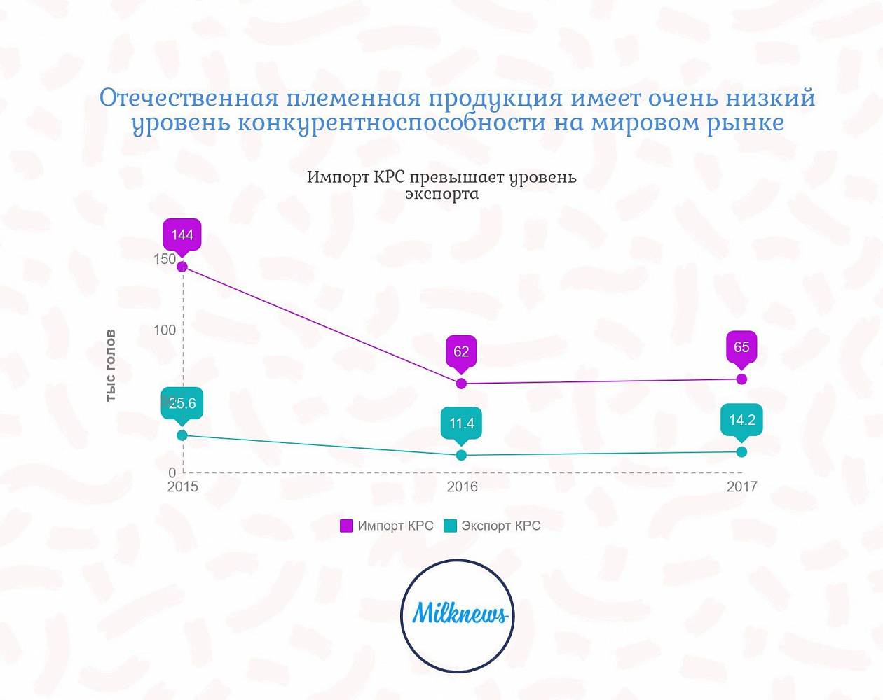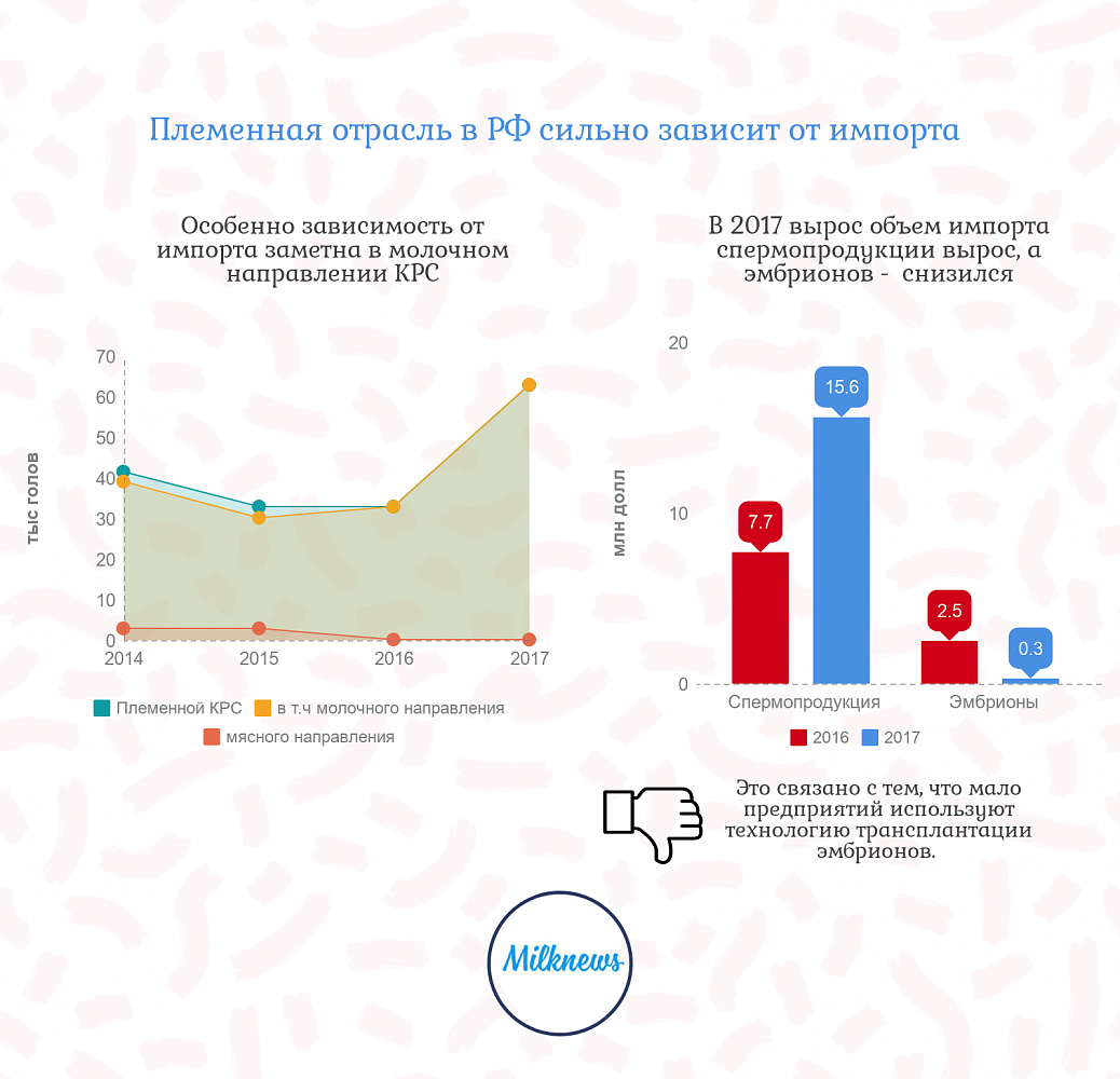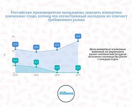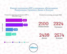 В 2017 году отмечено резкое возрастание импорта племенного КРС до 62,9 тыс. гол. с 32,9 тыс. гол. в 2016 году и 32,8 тыс. гол. в 2015 году из-за отмены в ноябре 2016 года 10% ставки по НДС на импорт племенных животных. Это решение снизило конкурентоспособность отечественных племенных предприятий и увеличило зависимость отрасли от импорта, доля которого достигла 43,6%.