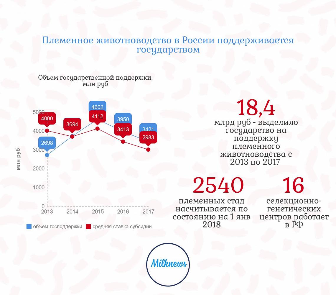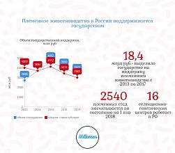 За 2013-2017 гг. объем субсидий, выделенных на поддержку племенного животноводства из федерального бюджета, составил 18,4 млрд. руб. Это позволило сформировать на территории страны сеть племенных предприятий. К 1 января 2018 года племенное животноводство в стране было представлено 2540 племенными стадами сельскохозяйственных животных, в том числе 16 селекционно-генетических центрами и 360 сервисными организациями в 81 регионе России.