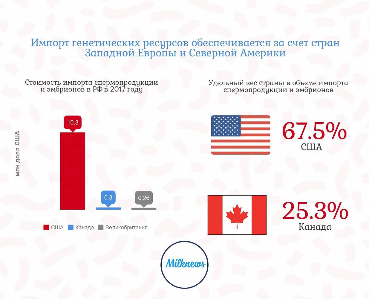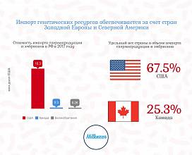 Импорт генетических ресурсов обеспечивается за счет поставок из ведущих мировых селекционных центров, расположенных в странах Западной Европы и Северной Америки. При этом импорт спермопродукции и эмбрионов обеспечивается за счет США и Канады, на которые приходится 67,5% и 25,3% от общего объема импортируемой в 2017 году спермопродукции, что выше чем в 2016 году США – 46,3% и Канады – 41,1%. В 2017 году отмечен рост импорта спермопродукции КРС до 15,6 млн долл. с 7,7 млн долл. в 2016 году в стоимостном выражении.