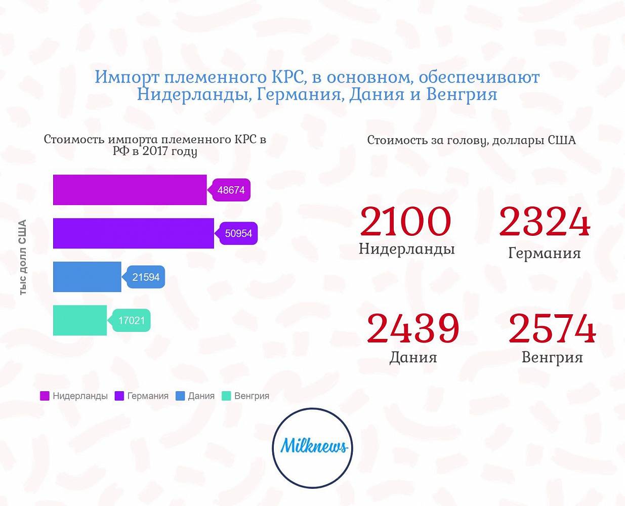 На сегодняшний день импортируется именно скот и именно молочного направления продуктивности, поскольку потребности мясного скотоводства России обеспечены собственными племенными ресурсами. Импорт племенного КРС обеспечивается за счет поставок из Нидерландов, Германия, Дании и Венгрии, на долю которых в 2017 году приходилось 36,8%, 34,9%, 14,1 % и 10,5%.