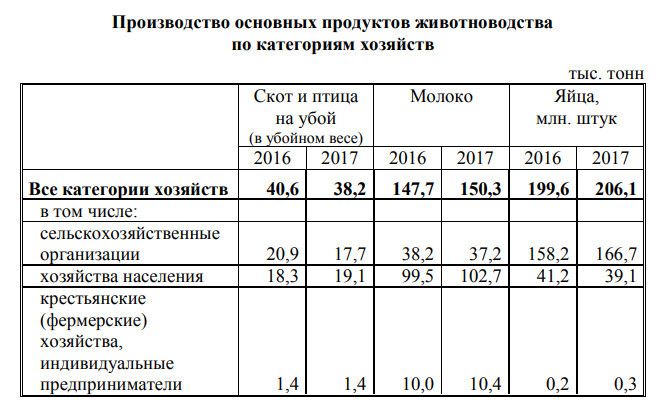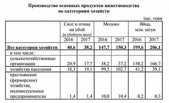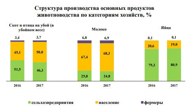 Основными производителями скота и птицы на убой (в убойном весе) в 2017 году были хозяйства населения. Их доля, по сравнению с 2016 годом, выросла на 4,9 процентного пункта. При этом удельный вес сельскохозяйственных организаций за этот период сократился на 5,2 процентного пункта. Удельный вес крестьянских (фермерских) хозяйств и индивидуальных предпринимателей увеличился незначительно – на 0,3 процентного пункта.