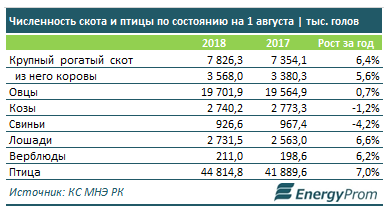 За год ощутимо увеличилось количество сельскохозяйственных животных и птицы. Так, на 6,6% выросло за год число лошадей - до 2,7 млн голов к 1 августа текущего года, а численность КРС составила 7,8 млн голов - плюс 6,4% за год. На 6,2% увеличилось поголовье верблюдов - до 211 тысяч.