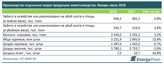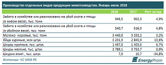 Также выросли показатели забоя скота и птицы в живом весе - на 4,9%, до 946,5 тыс. тонн; получено больше крупных шкур - на 6,7%, до 1,5 млн штук; отмечен рост надоев сырого коровьего молока - на 3,2%, до 3,4 млн тонн.