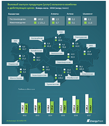 По данным Министерства нацэкономики, в Костанайской области рост сельскохозяйственного производства обусловлен увеличением производства коровьего молока на 6,5%, мяса всех видов - на 4,9%, яиц - на 0,9%. В Актюбинской области на рост повлияло увеличение производства куриных яиц на 27,9%, мяса всех видов - на 5,8%, коровьего молока - на 3,9%. В Мангистауской области рост обусловлен увеличением производства куриных яиц в 2,1 раза, мяса всех видов - на 8,3%, коровьего молока - на 6,9%.