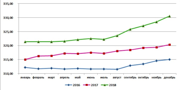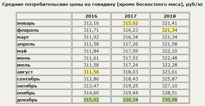 В декабре 2018 г. говядина (кроме бескостного мяса) в России стоила в среднем 330,58 руб./кг - на 0,6% больше, чем в предыдущем месяце, и на 3,2% больше, чем в декабре 2017 г. С начала года цена данного товара выросла на 2,9%. Это новый ценовой максимум для данного товара, по крайней мере, за последние три года.